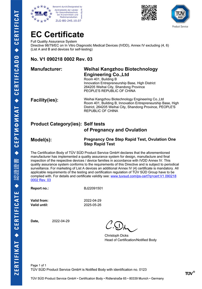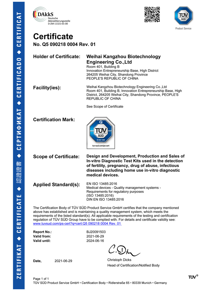 ? ? ?威海康州生物工程有限公司成立于2013年,公司坐落于風景秀麗的海濱小城——威海市。康州生物是集研發、生產和銷售于一體的生物科技公司,與威海哈爾濱工業大學合作研發團隊,擁有先進的科研基地及生產基地。主要從事快速診斷檢測產品的研發、生產、銷售。產品涵蓋:生育檢測、藥物濫用檢測、農藥殘留檢測以及其他臨床診斷檢測等。公司自主研發生產得早早孕試紙,排卵檢測試紙,毒品檢測及疾病檢測等醫用產品,經過歐盟認證,產品質量穩定,值得信賴。